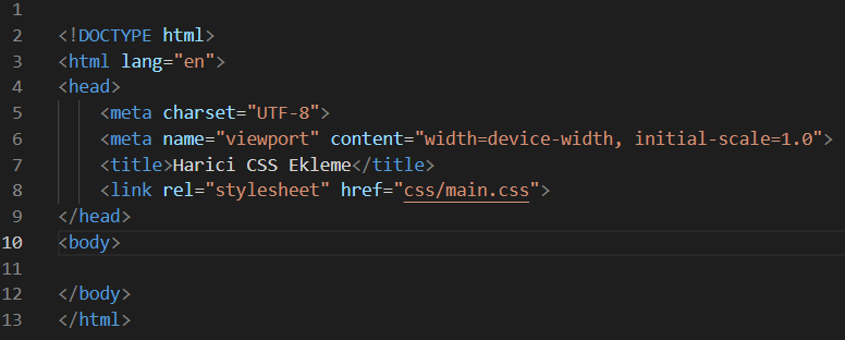 Css html dosyasında yazılıyorsa style etiketinin içerisine yazılır. Eğer farklı bir dosyada yazılıyorsa o dosyaya link verilerek projeye dahil edilir. Şimdi harici olarak css ekliyoruz. Aşağaki gibi html dosyasında link vererek main.css dosyasına yönlendiriyoruz. main. css dosyasındaki kodlar da sağ fotoğraftaki gibidir. Kodların aşağıda açıklanmıştır.