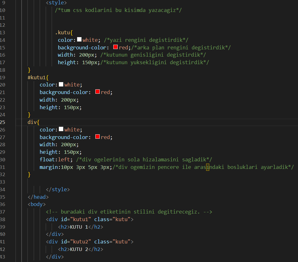 Burada class ve id farkını görüyoruz. Tek bir class adıyla birden fazla öğeye stil verebiliyoruz. Ama idleri tek bir öğeyle sınırlandırıyoruz. Kodların açıklamasını yorum satırlarında belirttim.