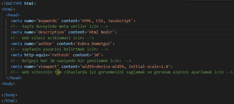 <meta charset=”utf-8″>: HTML kodunun Türkçe karakter desteği dahil olmak üzere pek çok dil seti içerdiğini belirtir.