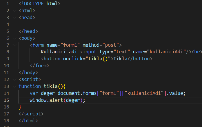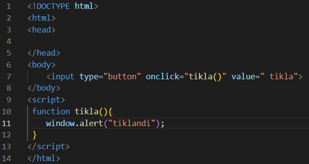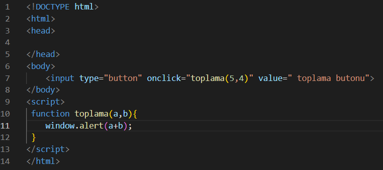 Bu örnekte, html kısmında buton tanımladık ve tıklandığında kullanıcıya mesaj vermesi için fonksiyon yazdık. Şimdi parametreli bir fonksiyon yazalım.
