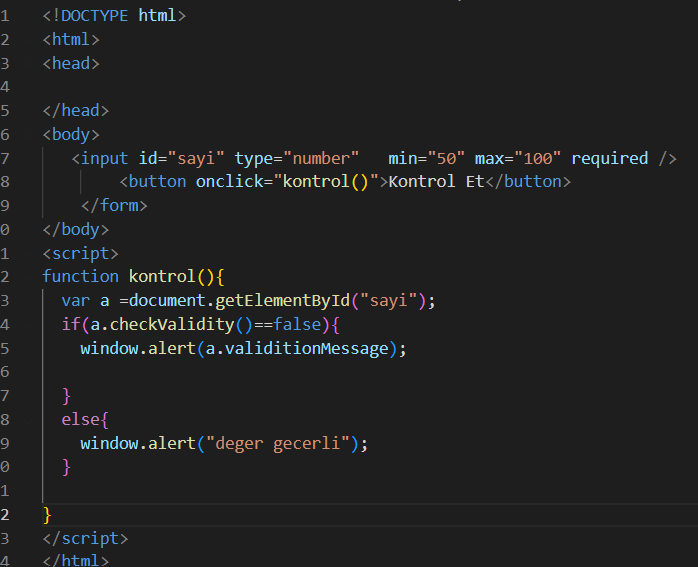 Girilen Değer 50–100 arasında değilse validation message olarak bilgi veren script örneğine bakalım.