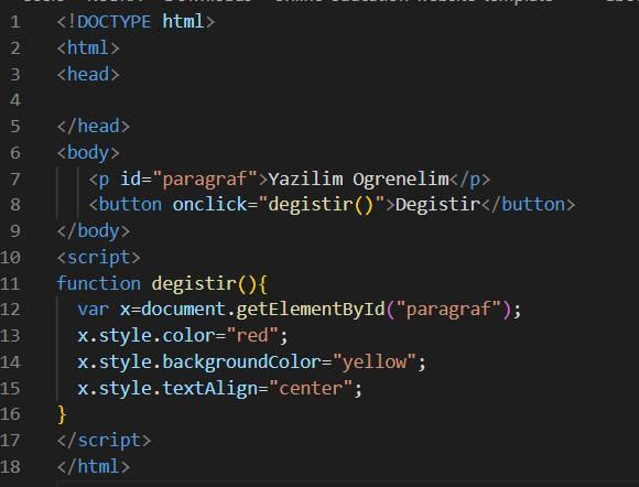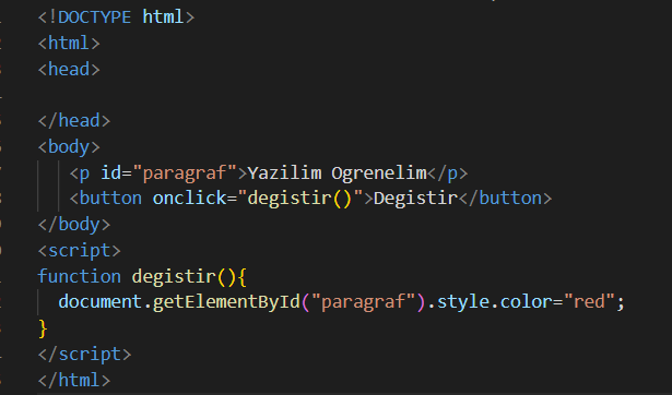 Elementlere JavaScript ile erişiyoruz ve onlara değişik özellikleri ekliyoruz. Burada butona tıklandığında yazının rengini değiştiriyoruz.