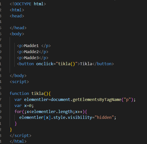 Buradaki kodda 3 tane p elementimiz bulunuyor. tikla butonuna tıkladığımızda bu 3 tane p elementi görünürlüğünü kaybedecek.